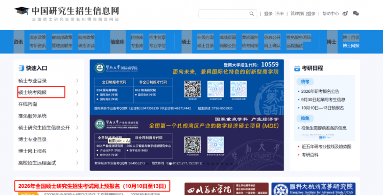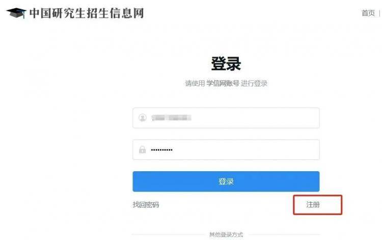打开研招网(),点击右上方“登录”或“注册”,已有账号的考生可直接登陆,没有学信网账号的同学请先注册学信网账号。建议考生关注学信网公众号并绑定微信账号(如已关注公众号,可在“学信账号-绑定学信网账号”菜单栏里,点击进入绑定页面),以便及时接收学籍学历校验及交费等消息提醒。