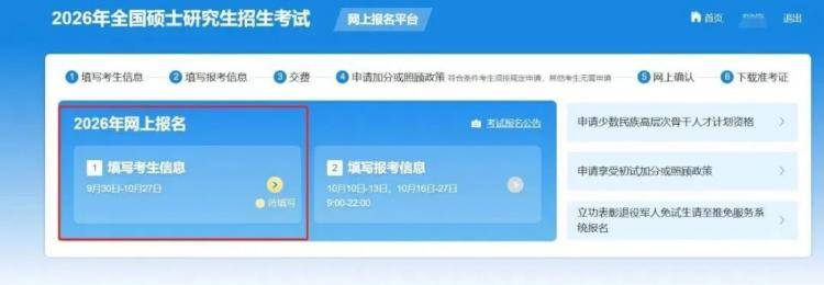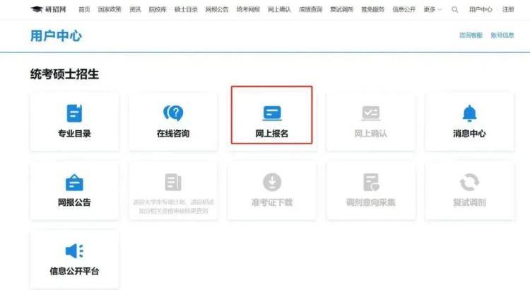 考生登录研招网之后点击“网上报名”开始网报,网报分为填写考生信息和填写报考信息2步: