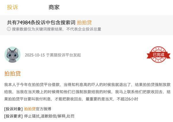 黑猫投诉平台数据显示,截至2025年11月,针对拍拍贷的投诉累计已达74000余条。其中,涉及“暴力催收”的投诉高达19000余条,涉及“个人信息”问题的投诉也有4000余条。