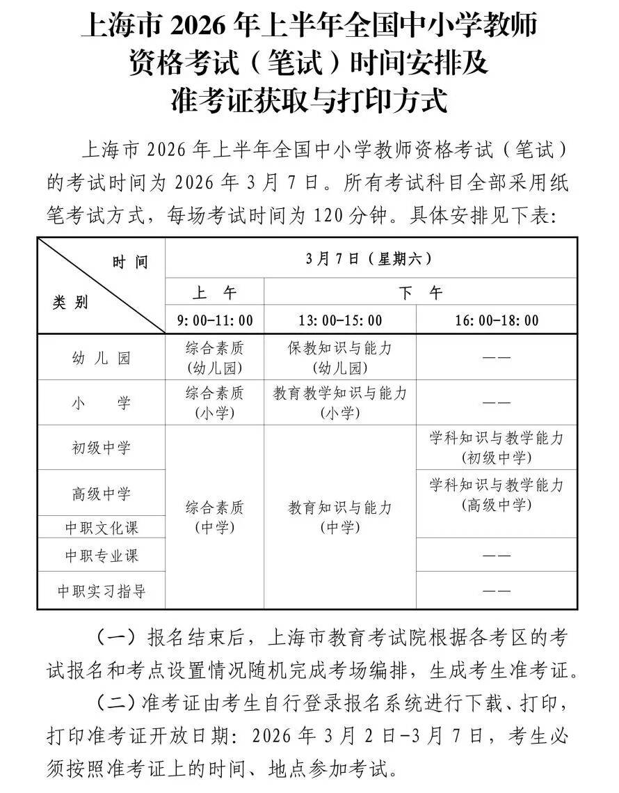 2026年3月7日笔试!上海市2026年上半年全PG电子技巧国中小学教师资格考试(笔试)报名公告发布