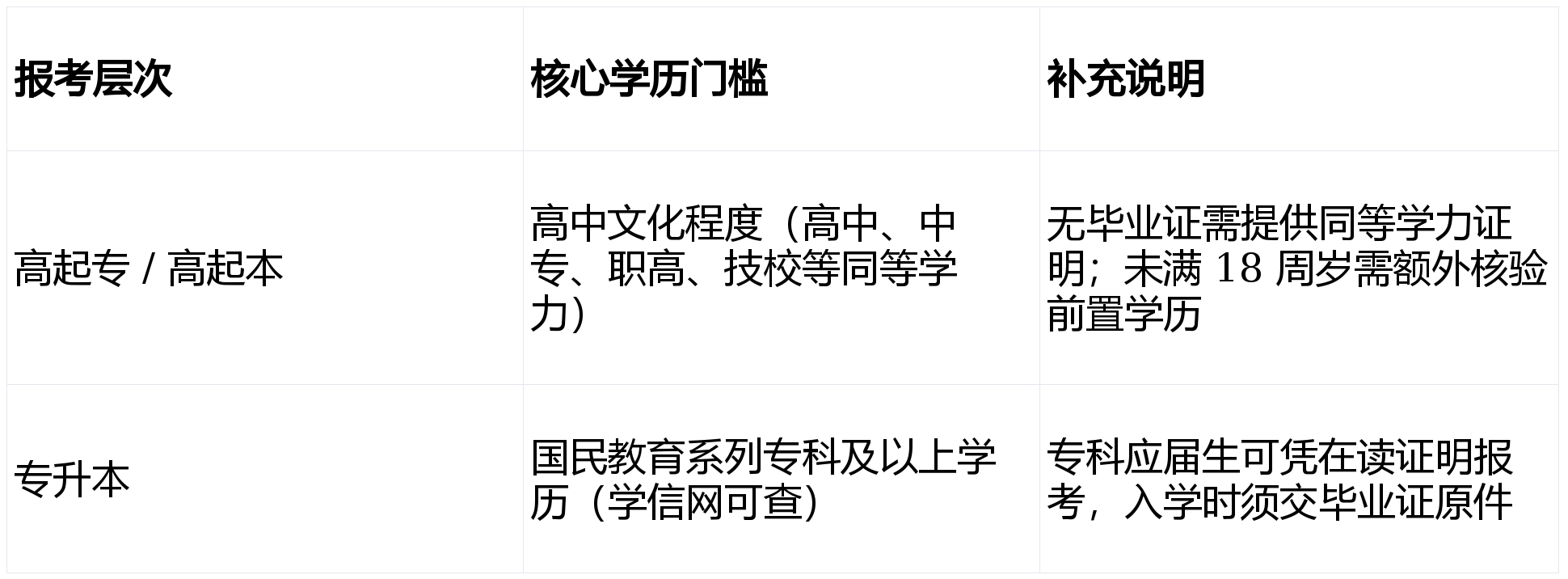 :专升本需国民教育系列专科及以上学历;高起本需高中 / 中专同等学力;非户籍地报考需居住证 / 社保 / 工作证明。
