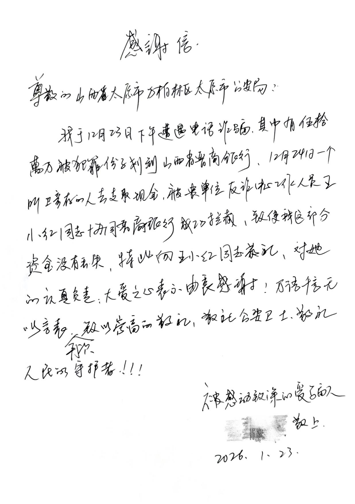 在警银双方的高效联动、密切配合下,这笔即将被取走的50万元涉诈资金,在最后一刻成功被冻结,稳稳守住了受害人王女士的“钱袋子”。事后,心怀感激的王女士特意寄来亲笔感谢信,对参与资金拦截的银行工作人员和民警表达了最真挚的谢意,用朴素的文字,定格了警银联动反诈的暖心瞬间。