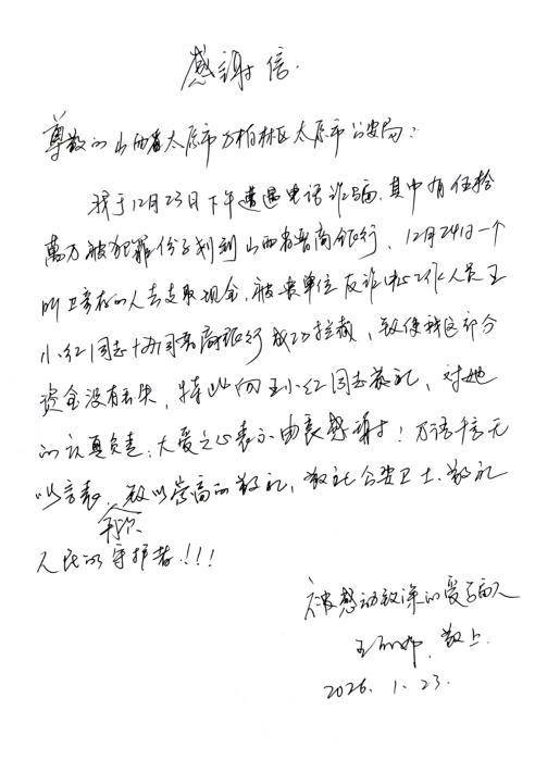 在警方与银行的联动配合下,这笔50万元资金在即将被取走的最后一刻成功冻结,守护了受害人王女士的财产安全。事后,王女士寄来亲笔感谢信,对参与资金拦截的工作人员表达感激之情。