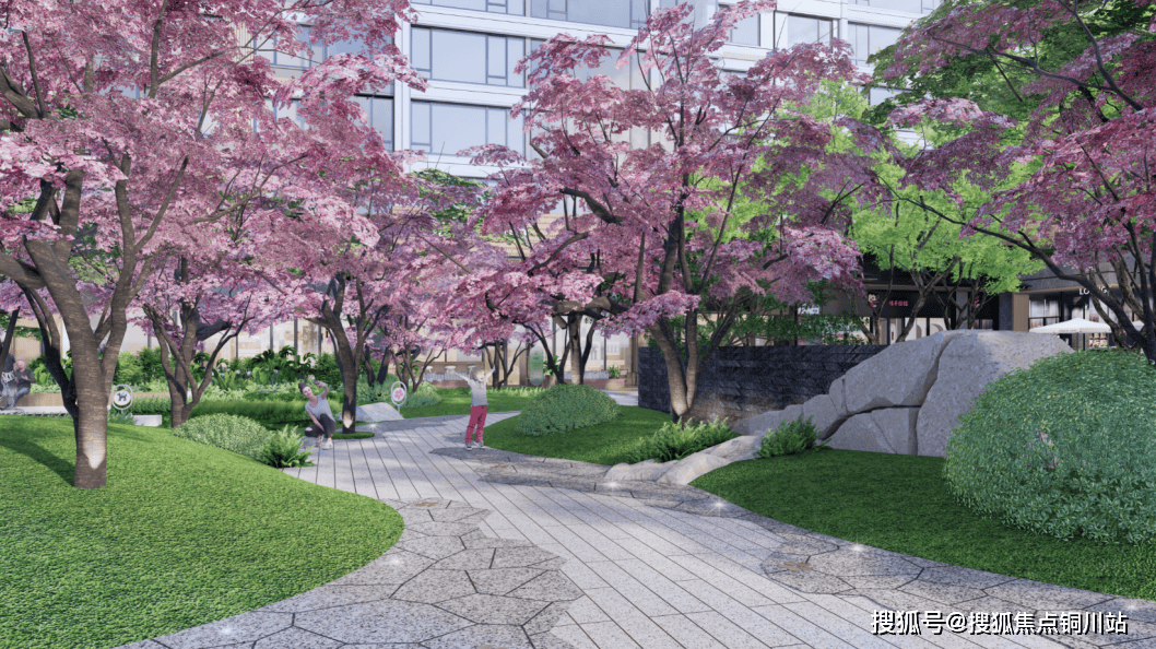 小区外围,街道与项目没有采用生硬围墙作为隔断,而是结合五感沉浸式樱浪公园实现过渡,更软性的融入