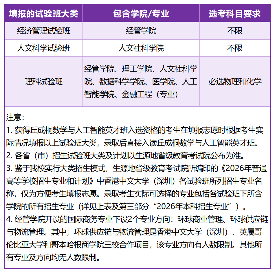 ◉ 有意向申请香港中文大学与香港中文大学(深圳)“跨学科数据分析+X双主修项目”、“航天科学与地球信息学+X双主修项目”或“材料科学与工程学+X双主修项目” 等项目(有关现有及2026年新增的项目信息详见招生官网)的学生在志愿填报期间或录取后选课前提交申请,并参加学校组织的考核,考核通过后方可入读。学生在深港两地校园轮换上课和实习,各修读两年。