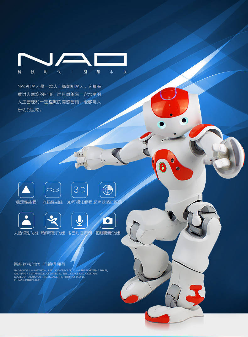 NAO 是Aldebaran Robotics公司(已被软银集团收购)制造的,一个应用遍及全球教育市场的双足人形机器人。58公分高的 NAO 拥有与人类一样自然的肢体语言,能够听、能够看、能够说 ,也能够与人互动 ,或 NAO 之间彼此进行互动。NAO 提供一个独立、完全可编程、功能强大且易用的操作应用环境。